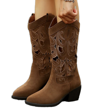 Neue Beliebte Ausgehöhlte Bestickte Vintage Western-Stiefel Damen Herbst Blockabsatz Kniehohe Cowboystiefel Damen Leder-Ritterstiefel