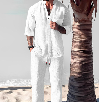 Verão Casual Algodão Linho Two Piece Men Set Moda Loose V Neck Meia Manga Tops e Calças Ternos Mens