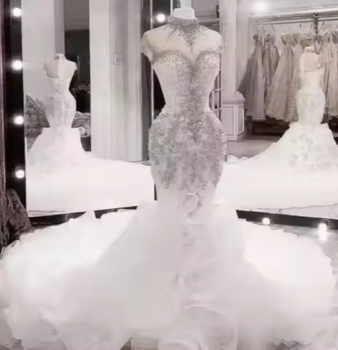 Mới sang trọng Nàng Tiên Cá Wedding Dress shinning đính cườm Bridal DRESS Ngắn Tay Áo xù Bridal gown